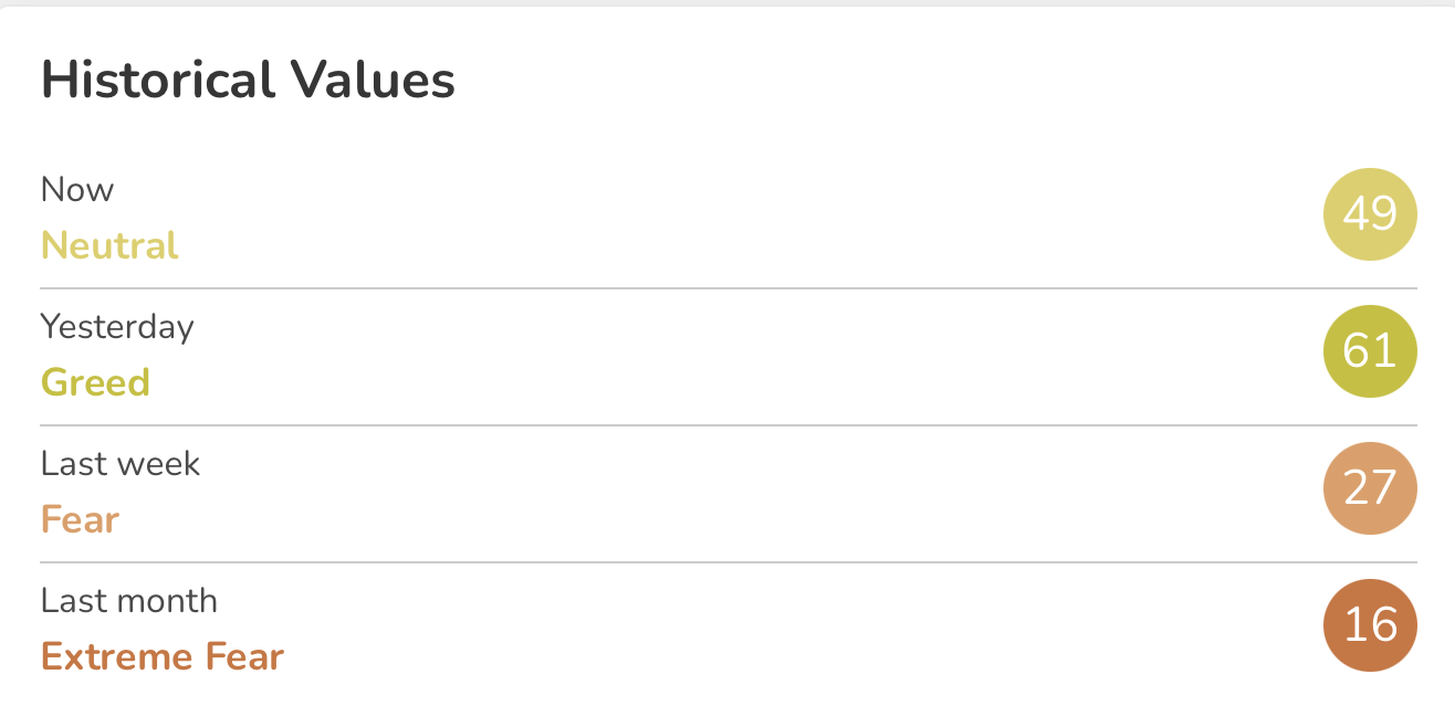 Today's score slid down to 49 as Bitcoin prices stabilizes around $95,000.