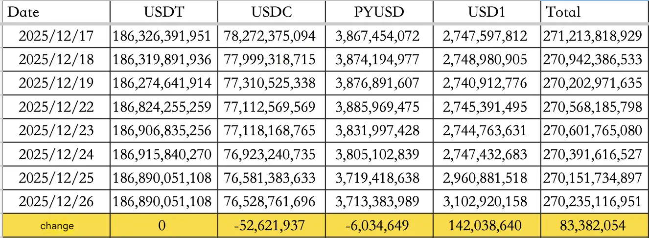 Am 26. Dezember verzeichneten Stablecoins einen Nettozufluss von 83,38 Mio. USD. USDC verzeichnete Abflüsse von 52,62 Mio. USD, während USD1 Zuflüsse von 142,04 Mio. USD verzeichnete. Das gesamte Stablecoin-Angebot beläuft sich nun auf 270,24 Mrd. USD.