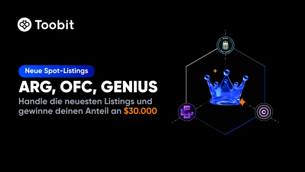 ARG, OFC, GENIUS sind offiziell auf Toobit gelandet, und wir feiern dies auf große Weise. Nehmen Sie an unserer exklusiven Handelskampagne teil und beanspruchen Sie Ihren Anteil am Preispool von 30.000 $, einschließlich 10.000 USDT in Boni und 20.000 $ in Token-Airdrops.