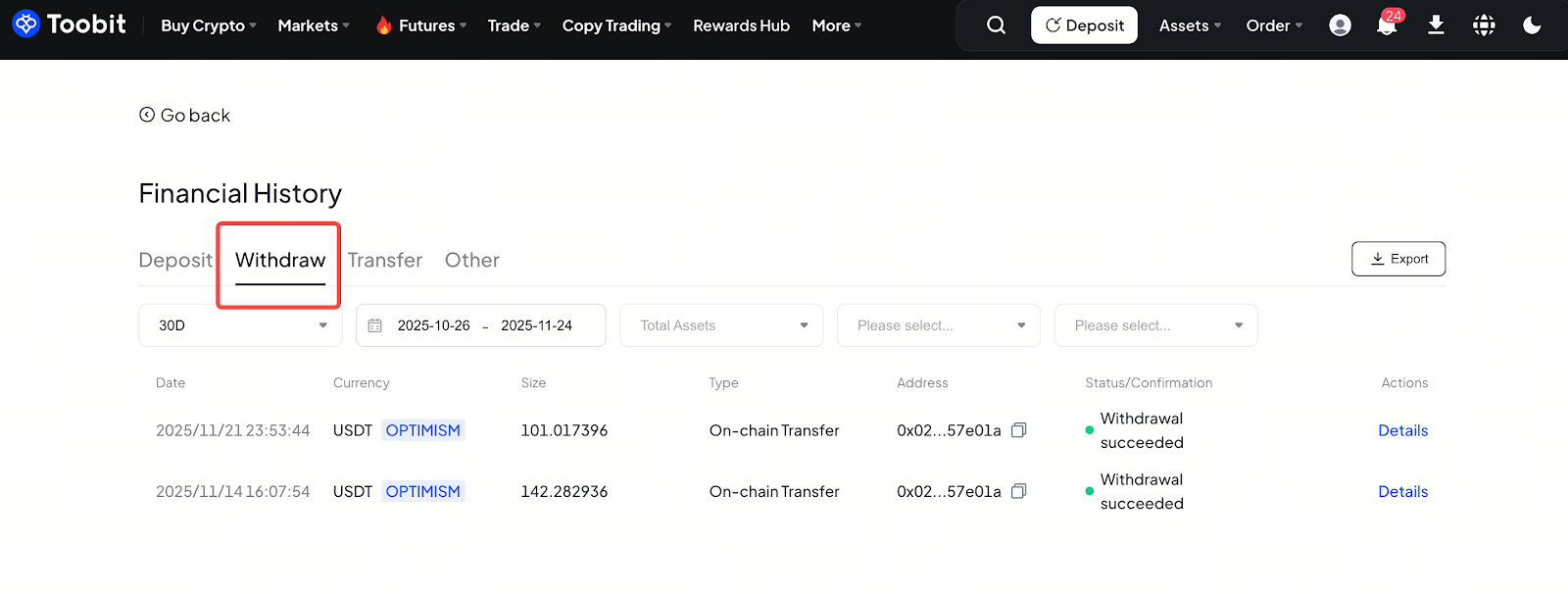 Dieser Artikel erklärt, wie Sie den Status Ihrer Auszahlungen auf Toobit prüfen können. Folgen Sie den Schritten unten, um Ihren Auszahlungsfortschritt schnell einzusehen und zu verstehen.