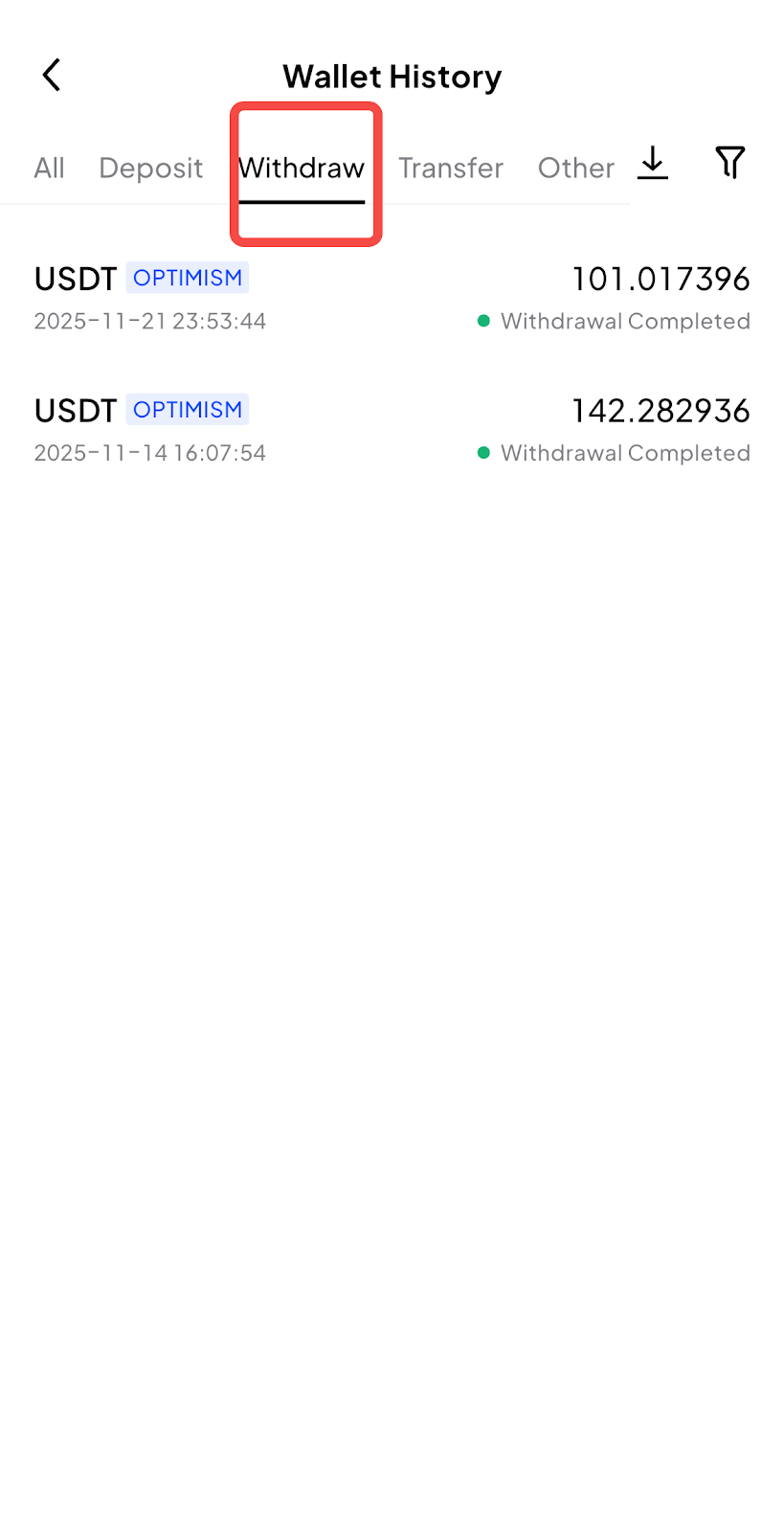 3. Wählen Sie auf der Seite [Wallet-Historie] die Option [Auszahlung].
