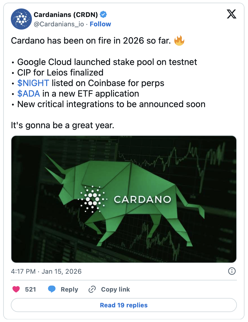 Cardano's community X account, @Cardanians_io, outlined 5 major developments for ADA since 2026 began, which includes the Cardano Improvement Proposal (CIP), Google Cloud launching an ADA stake pool on testnet, and ADA ETF applications.