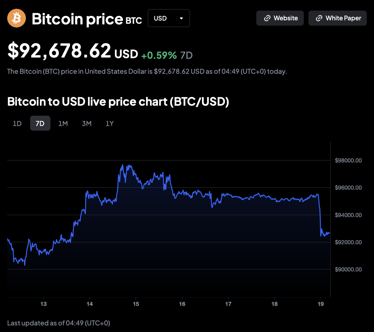 This week opens with Bitcoin trading in the low $90,000s. The latest 7D chart shows BTC at $92,678 and slightly positive on the week, but that headline number hides a rough path to get here.
