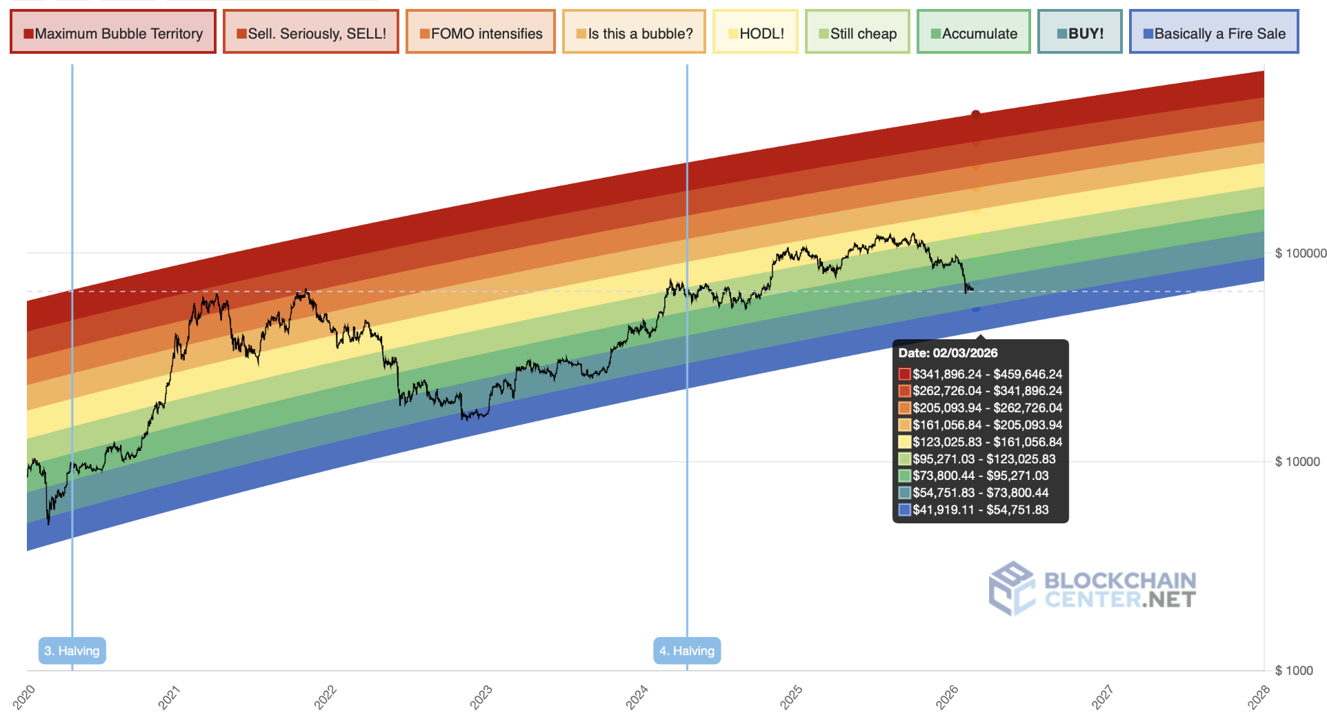 BTC rainbow chart from BlockchainCenter