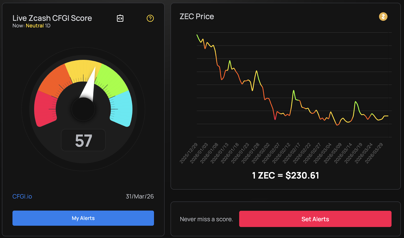Crypto Fear and Greed Index (CFGI) on March 31, 2026 for ZEC