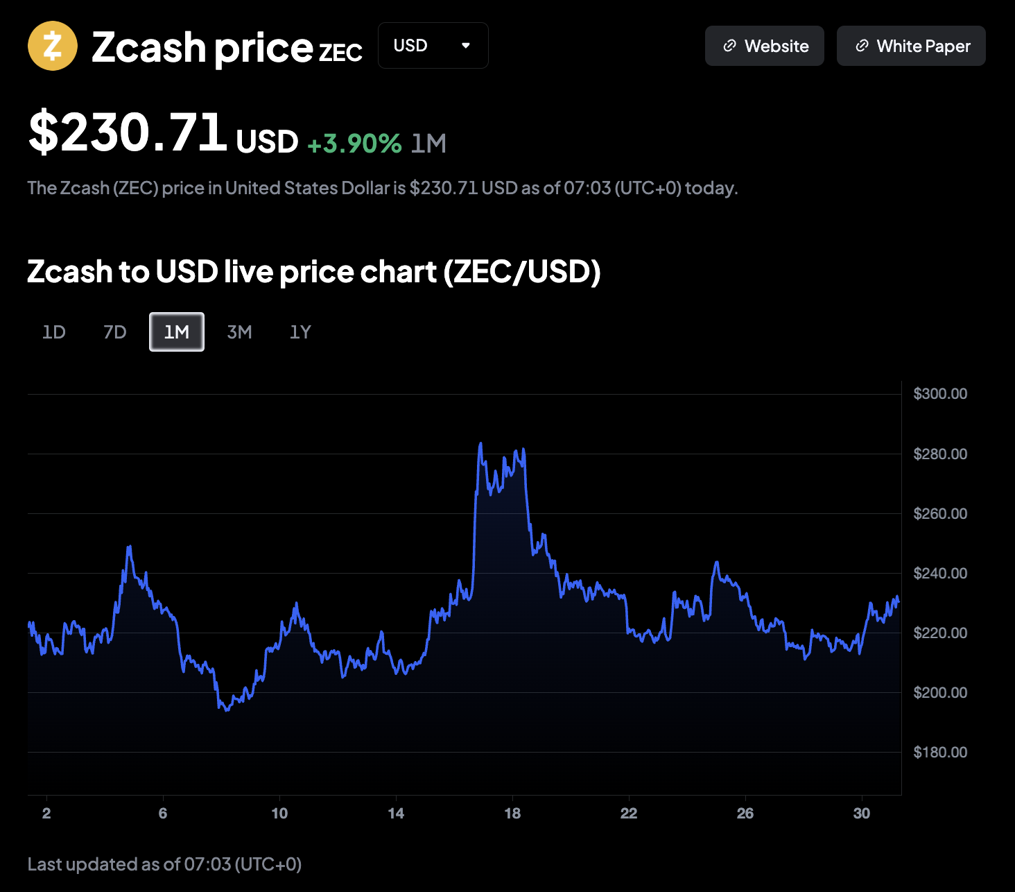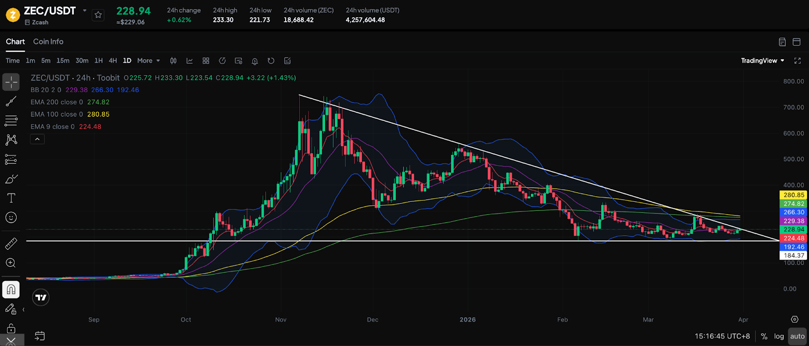 ZEC’s price currently sits at $230.71, up 1.55% in the last 24 hours. Its market cap is currently at $3.83 billion with a circulating supply of 16.6 million ZEC.