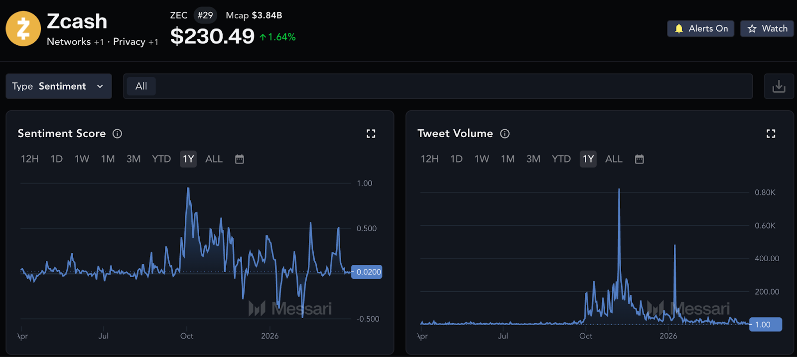 ZEC has a Sentiment Score of 0.02 for March 31, 2026 on Messari, with -1.0 being the lowest and 1.0 the highest. Curiously, sentiment appears the highest for 2026 at 0.248 on January 28 around the time Gemini launched its Zcash credit card.