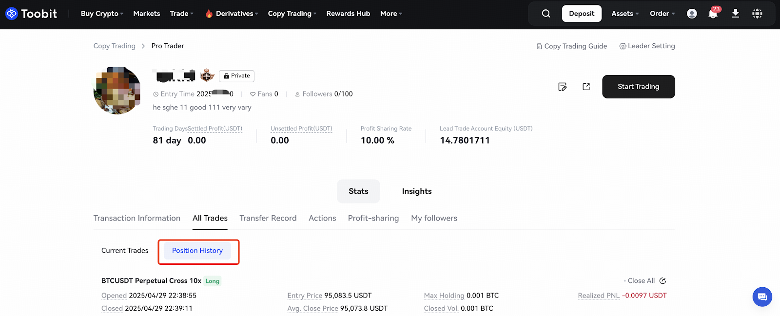 On the Pro Trader Homepage, click Position History under All Trades to view your copy trading position history.
