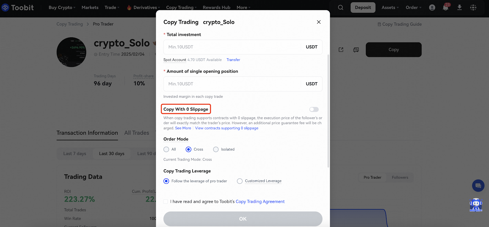 - For new followers: Go to the Copy Trading page, select a pro trader, and turn on "0 Slippage Copy" during the setup process.