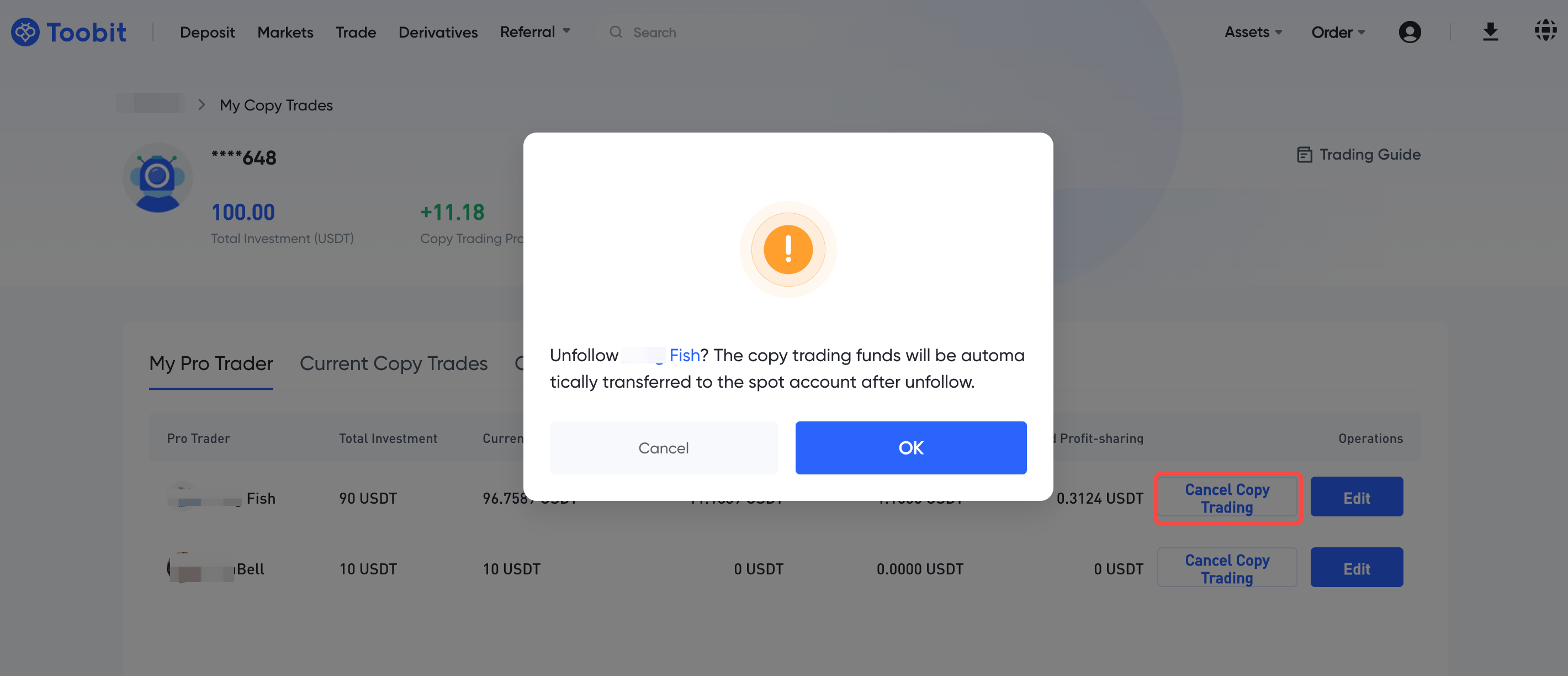 3. All the funds will be transferred to the spot account automatically once you unfollow the pro trader.