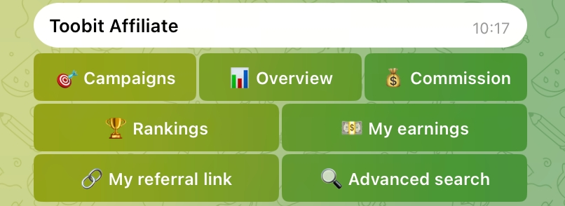 Toobit Affiliate Bot is an intelligent tool built specifically for Toobit partners and affiliates, designed to help you manage affiliate campaigns more efficiently, monitor performance data in real time, and track commission earnings. With the Toobit Affiliate Bot, you can stay on top of performance changes, monitor your earnings, easily manage referral links, and optimize your promotional campaigns.