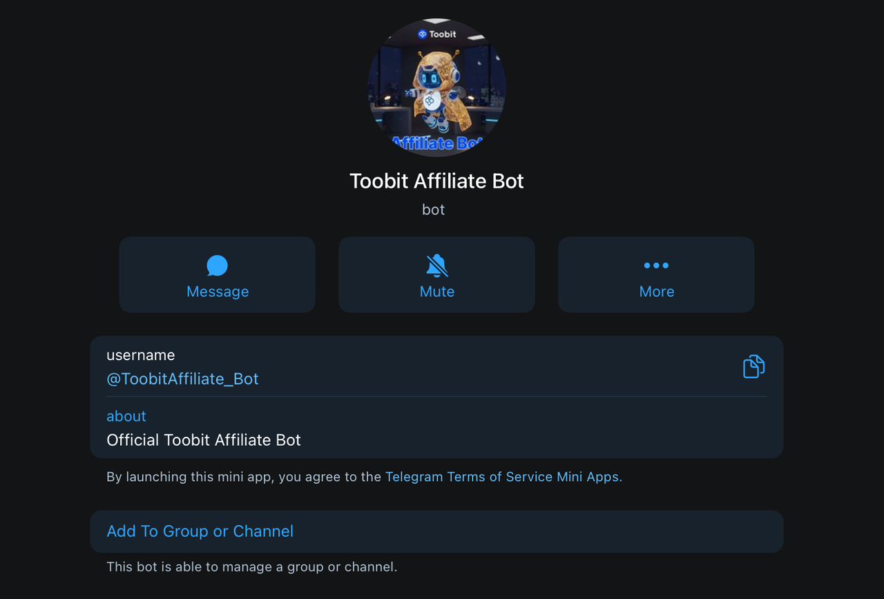 Option 2: If you have already configured a group bot in the affiliate dashboard, you may choose to use your own custom bot, which provides the same features and functionality. For detailed setup instructions, please refer to the Toobit Telegram group bot user guide.