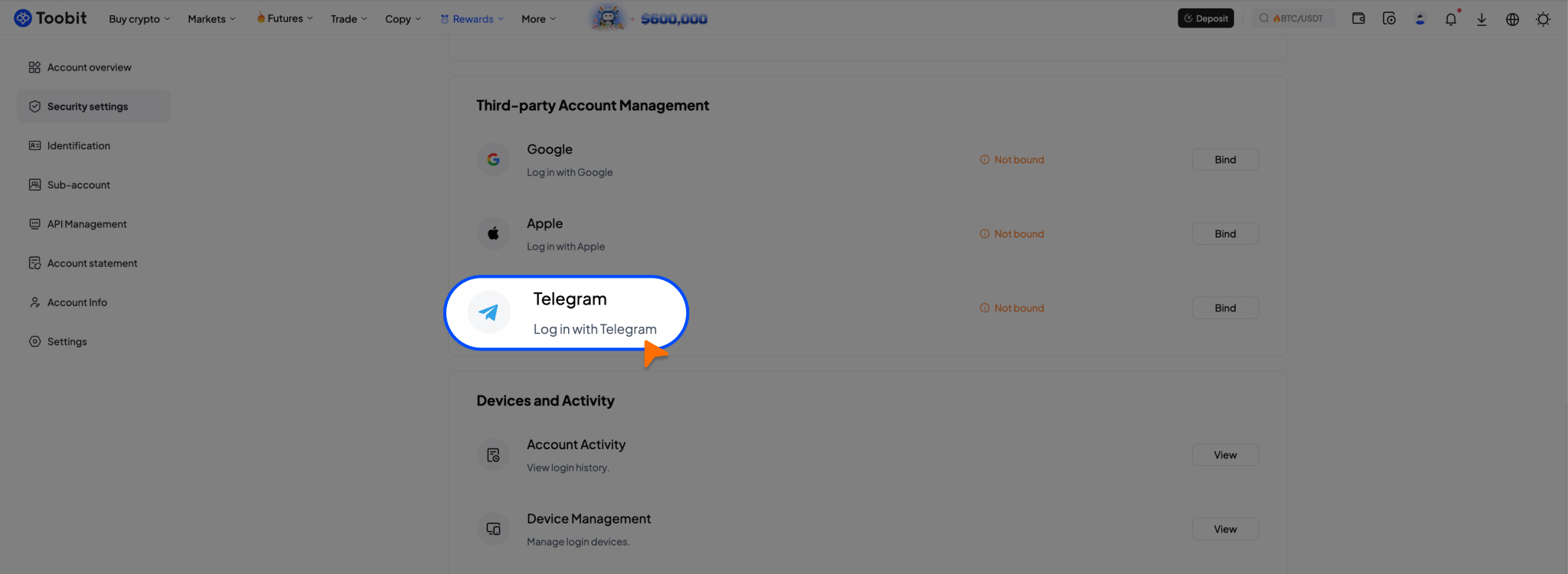 Step 2: Go to [Security settings] → [Third-party account management], then select Telegram to complete the connection.