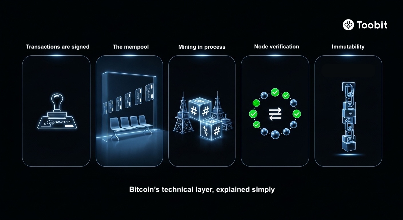 Una vista simplificada de cómo BTC se mueve desde transacciones firmadas al mempool, se mina a través de Prueba de Trabajo, es verificado por nodos y se bloquea en una cadena inmutable.
