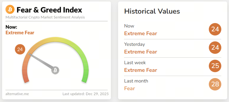 El dominio de Bitcoin cayó un 0,07% a 59,49%, mientras que el Índice de Miedo y Avaricia se mantuvo estable en 24, manteniendo el sentimiento firmemente en territorio de miedo.