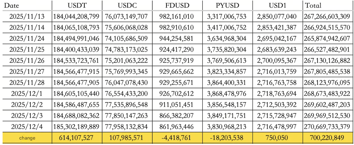 La actividad de stablecoins añadió soporte. Las entradas totales alcanzaron $700.22M, elevando la oferta circulante a $270.67B. Esto incluyó $614.11M en entradas de USDT y $107.99M en USDC.