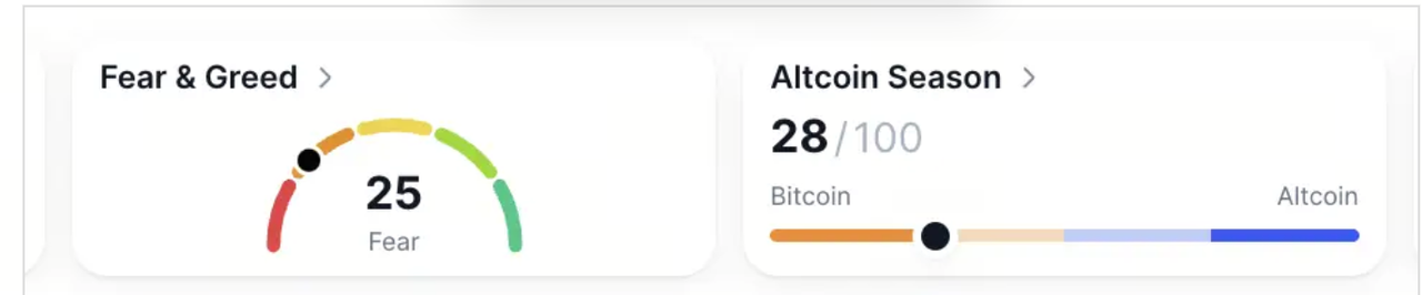El Índice de Miedo y Avaricia cayó a 25, señalando una profunda cautela, mientras que el Índice de Altcoin se movió a 28.