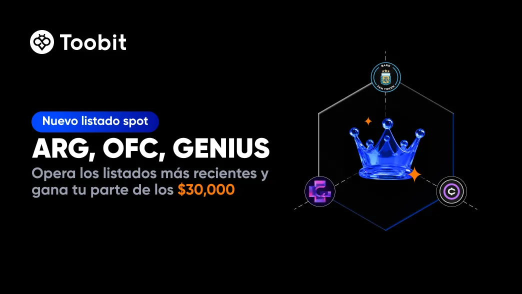 ARG, OFC, GENIUS han aterrizado oficialmente en Toobit, y lo estamos celebrando a lo grande. Únete a nuestra campaña de trading exclusiva y reclama tu parte del premio de $30,000, incluyendo 10,000 USDT en Bonos y $20,000 en airdrops de tokens.
