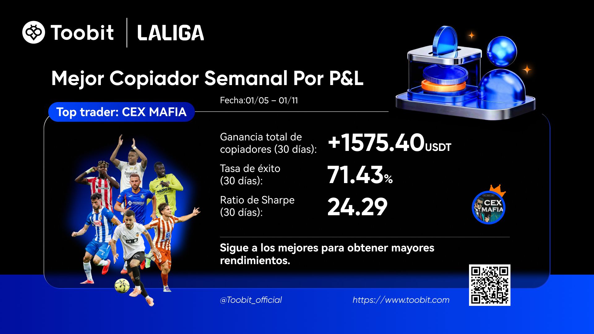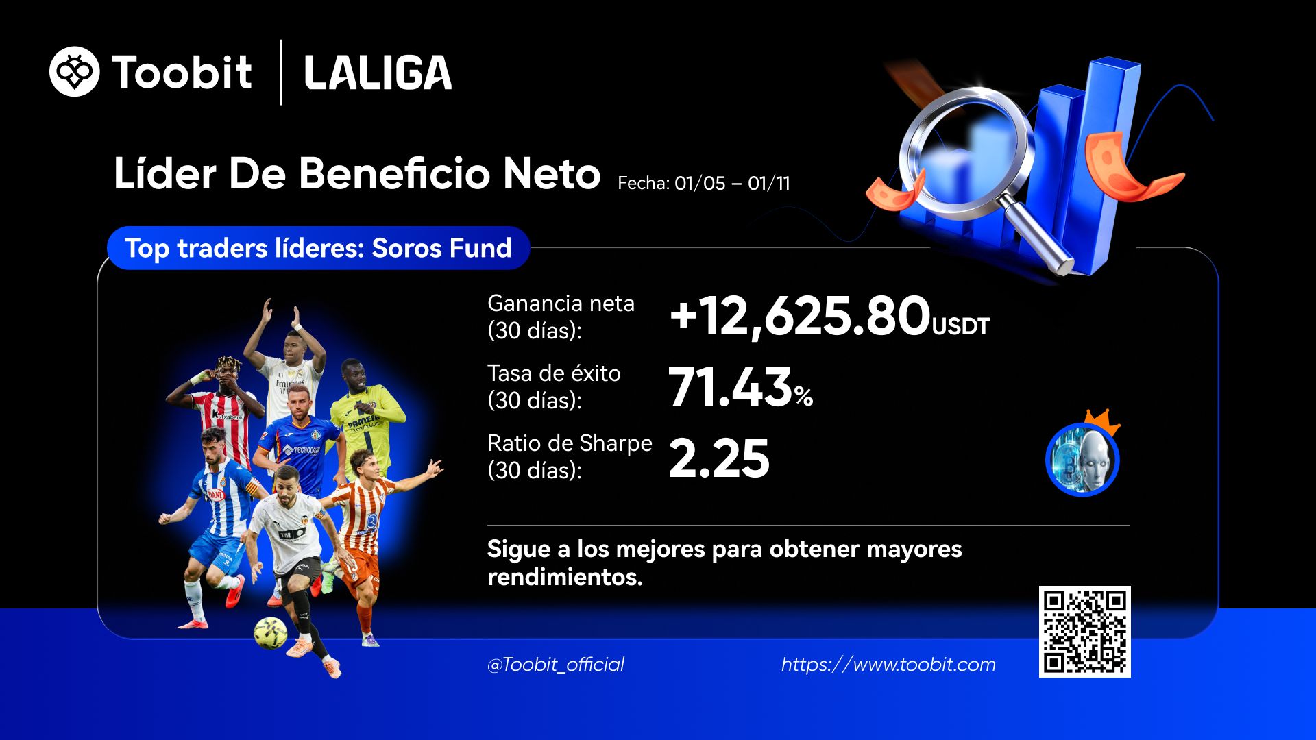 Para ayudarles a tomar decisiones informadas en nuestro ecosistema de Copy Trading, hemos lanzado nuestro Ranking Semanal de Traders Líderes. Basándonos en datos de los últimos 30 días, evaluamos a los traders en 3 dimensiones clave: ROI, beneficio neto y ganancias de copiadores.