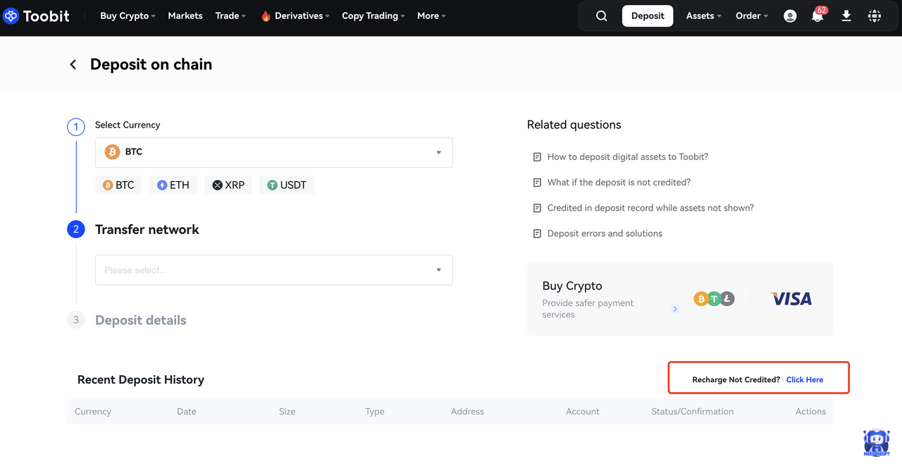 Visite la Plataforma de Depósito de Toobit y haga clic en Recarga No Acreditada. Haga Clic Aquí en la esquina inferior derecha de la página.