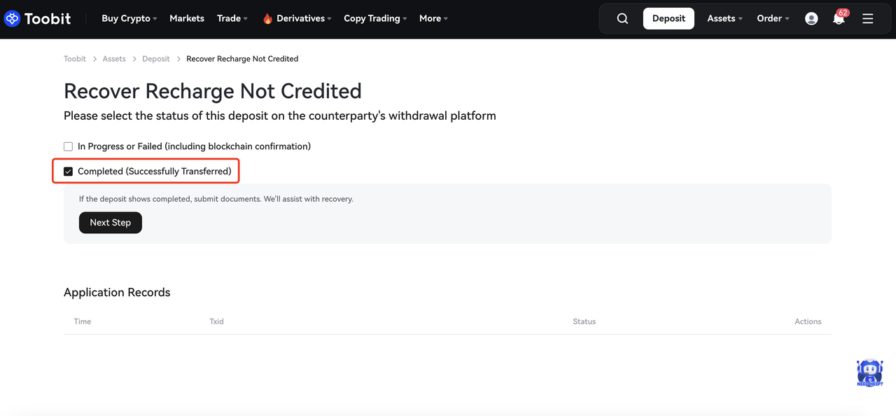 Nota: Si el depósito no se ha realizado o ha fallado, por favor espere o contacte a la otra plataforma. Los fondos aún no están con Toobit.
