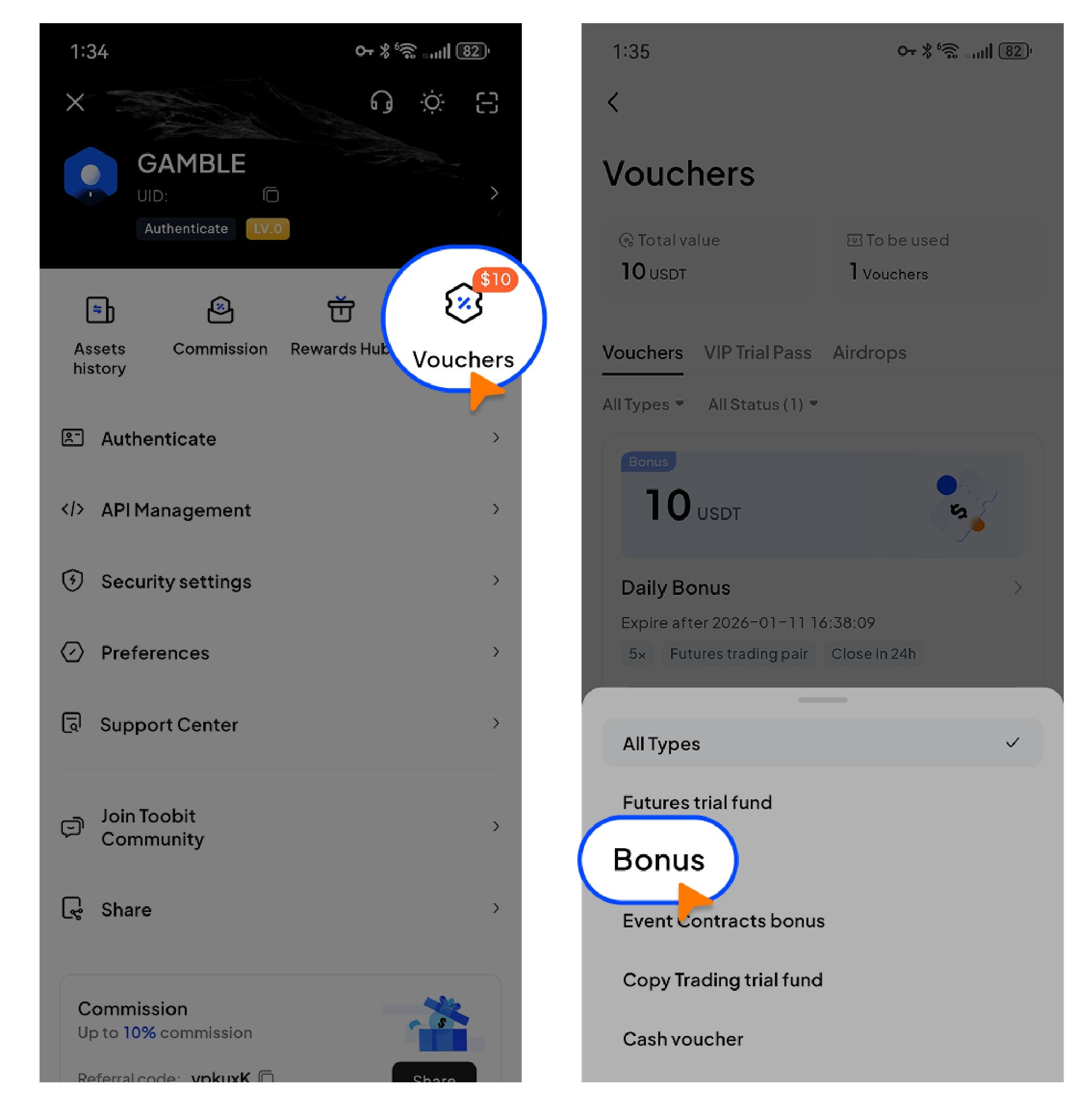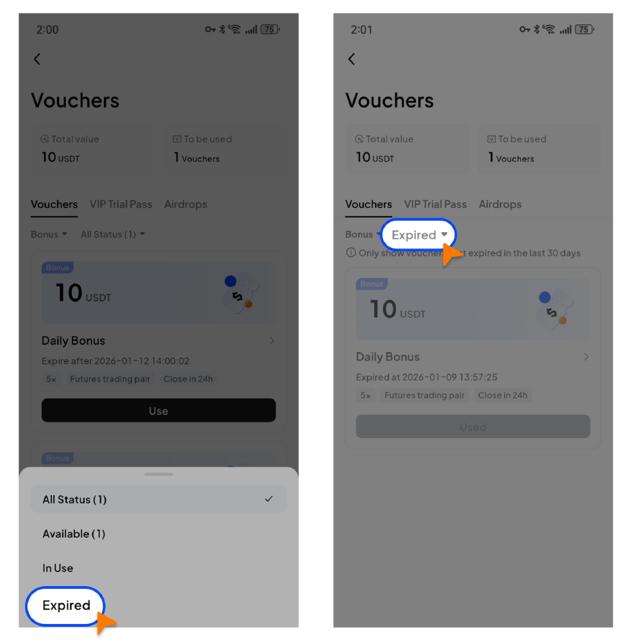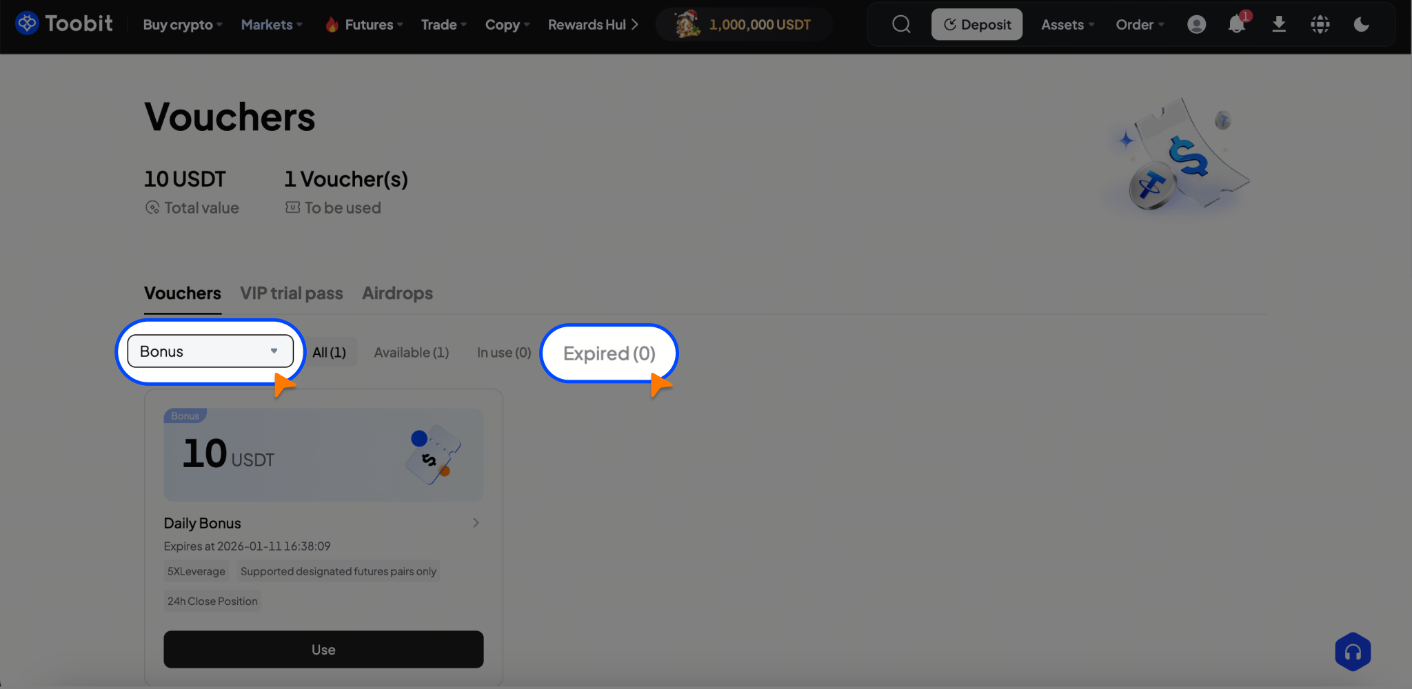 Web: Ve a [Vales] → [Bono de Futuros] → Cambia a [Expirado] para ver bonos usados o expirados.