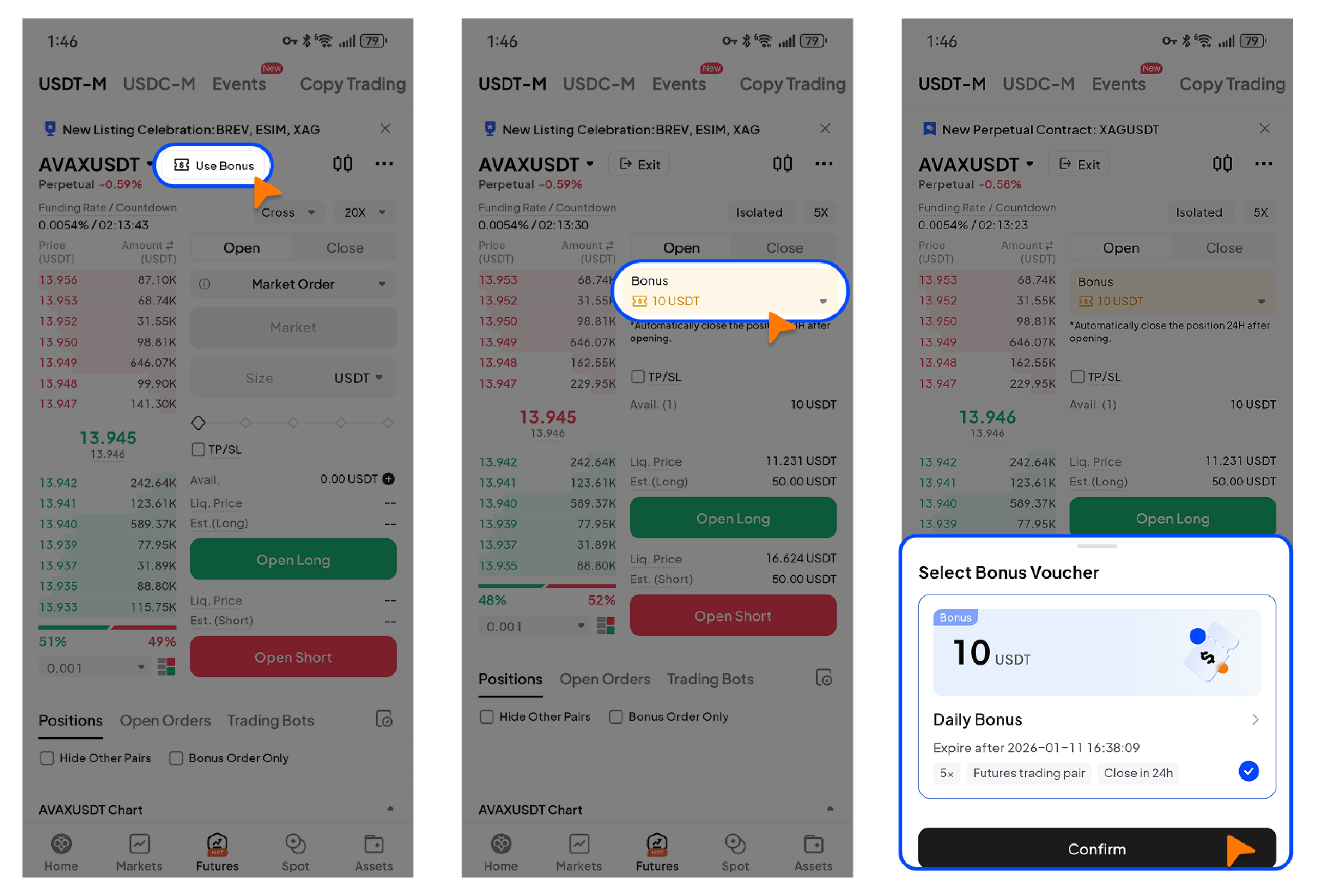 Los usuarios también pueden hacer clic en [Orden de bono] en la esquina superior derecha de la página de trading de futuros para ver los Bonos de Futuros disponibles.