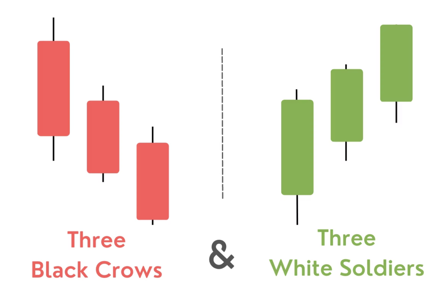 سه کلاغ سیاه: این الگو شامل سه نمودار شمعی نزولی پشت سر هم، که هر کدام از نمودار شمعی قبلی با قیمتی پایینتر بسته میشوند و به عنوان یک علامت قوی برای بازگشت جهت نزولی بازار در نظر گرفته میشوند.