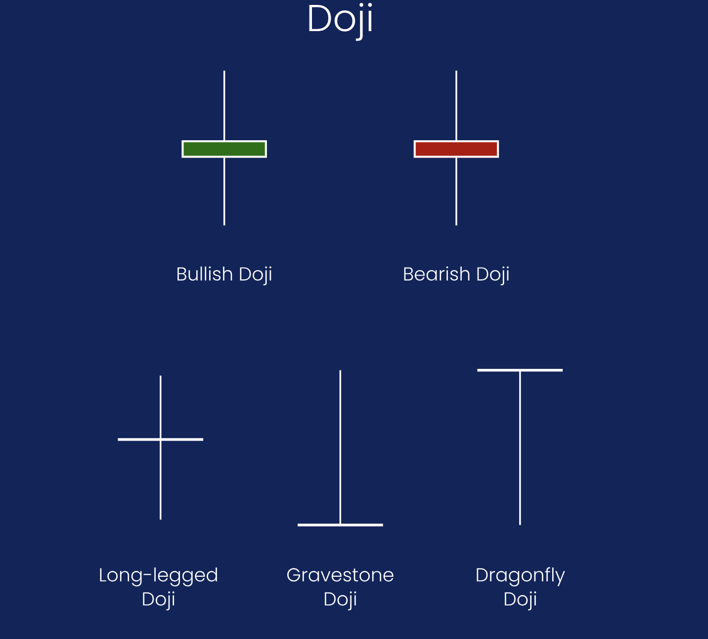 وقتی که قیمتهای باز شدن و بسته شدن معاملات تقریباً بر هم منطبق شوند، یک الگوی دوجی( Doji) شکل میگیرد که با بدنهای کوچک یا بسیار ناچیز با دنبالههای بلند مشخص میشود. این الگو نشاندهنده عدم قطعیت و تردید در بازار بوده و معمولاً، به خصوص پس از یک حرکت صعودی یا نزولی قابل توجه، میتواند حاکی از برگشت احتمالی روند بازار باشد.