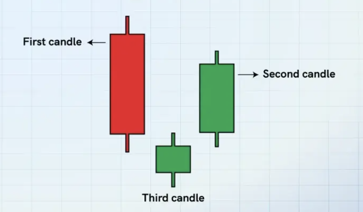 یک نمودار شمعی سبز بزرگ که بالای نقطه میانی نمودار شمعی اول بسته میشود.