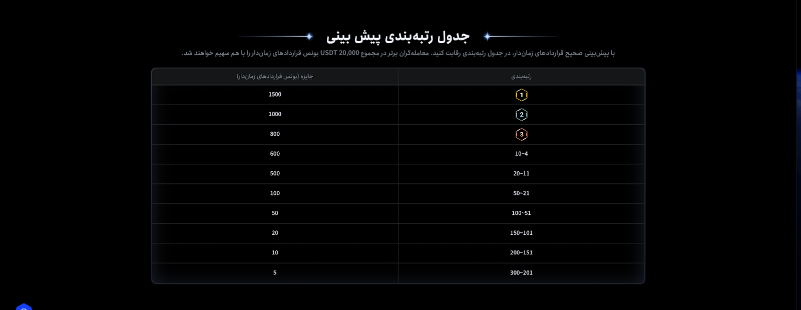 در این بخش، استخر جایزهای به ارزش 20,000 USDT به 300 معاملهگر برتر با بیشترین پیشبینی صحیح اختصاص داده شده است.