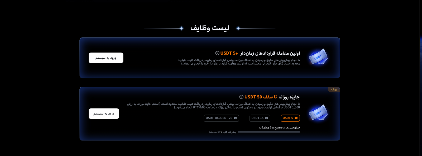 پس از آن، با انجام پیشبینیهای صحیح و رسیدن به اهداف روزانه، میتوانید روزانه تا 50 USDT (شامل 40 USDT بونس قرارداد زماندار و 10 USDT بونس) دریافت نمایید.