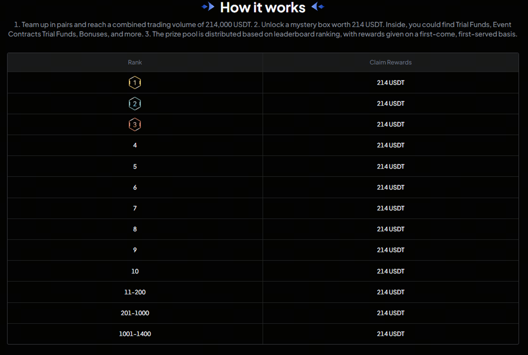 هدف «214» تصادفی نیست؛ این عددی به نشانهی 14 فوریه (روز ولنتاین) است. تیمهایی که مجموع حجم معاملات آنها به 214,000 USDT برسد، یک جعبه اسرارآمیز به ارزش 214 USDT دریافت میکنند که میتواند شامل سرمایه اعتباری، سرمایه اعتباری قراردادهای زماندار یا بونسهای مختلف باشد. در نهایت، رتبهی شما در جدول رتبهبندی مشخص میکند که چه سهمی از استخر جایزهی اصلی دریافت خواهید کرد.