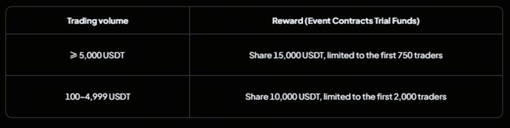 هر معاملهگری که به 100 USDT در حجم معاملات قراردادهای زماندار برسد، واجد شرایط ورود به این جدول خواهد بود. رتبه نخست 6,000 USDT دریافت میکند و جوایز دیگری نیز میان 50 معاملهگر برتر توزیع میشود.