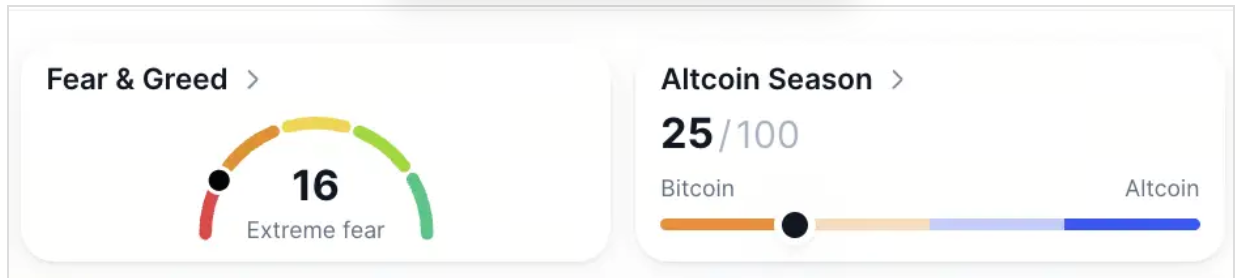 شاخص ترس و طمع عدد 16 را ثبت کرد و در محدودهی «ترس شدید» باقی ماند. از سوی دیگر، شاخص فصل آلتکوینها روی عدد 25 قرار گرفت که نشاندهنده چرخش دوباره توجه به سمت داراییهای اصلی است. در همین حال، سلطهی بیتکوین با 0.12% افزایش به 59.49% رسید.