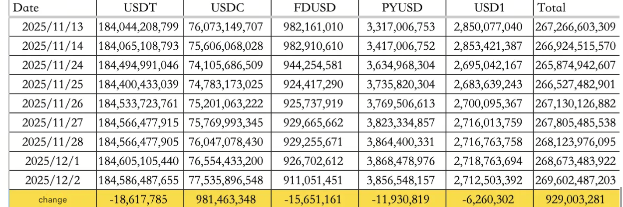 ورودی کل سرمایه در تاریخ 2 دسامبر به 929 میلیون دلار رسید؛ رقمی که عمدتاً بهواسطه افزایش 981.46 میلیون دلاری عرضه USDC شکل گرفت و توانست خروج 18.62 میلیون دلاری از USDT را جبران کند. اکنون عرضه در گردش استیبلکوینها به 269.60 میلیارد دلار رسیده است.