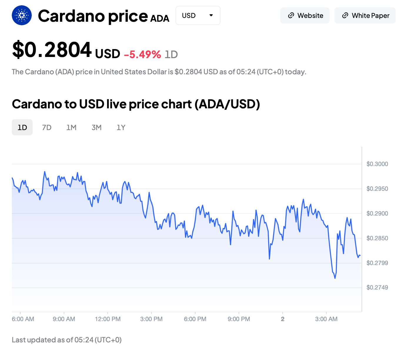 طبق دادههای Toobit، رمزارز ADA در محدوده $0.2804 معامله میشود؛ هرچند که قیمت در ساعات اولیه امروز، برای لحظاتی به سطح $0.2769 نیز رسیده است.