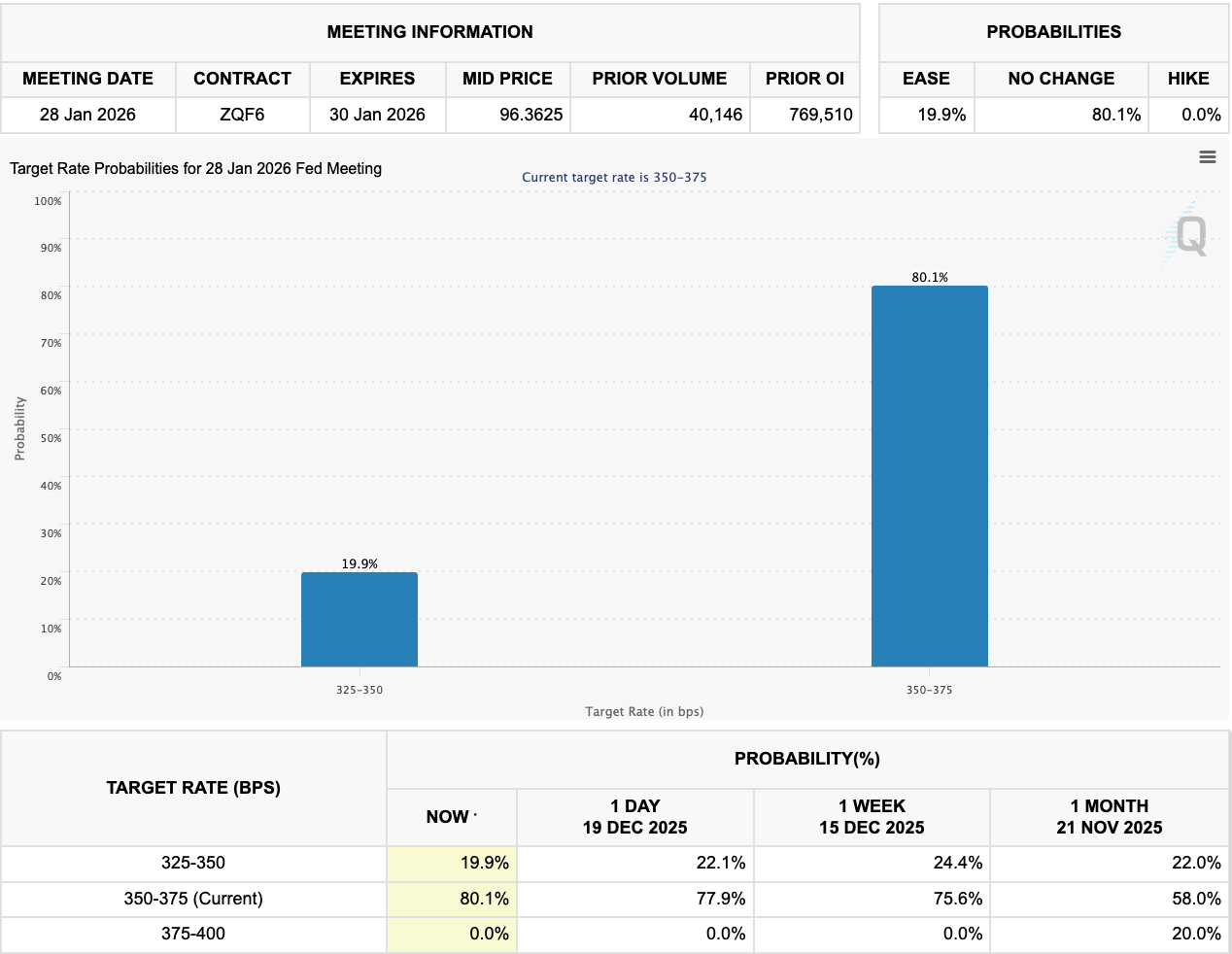 انتظارات نرخ بهره همچنان بهعنوان ریل محافظ بازار عمل میکند. بر اساس دادههای FedWatch، بازار همچنان به حفظ نرخ بهره در نشست بعدی متمایل است و احتمال «عدم کاهش نرخ» برای ماه ژانویه آینده حدود 80.1% برآورد میشود.