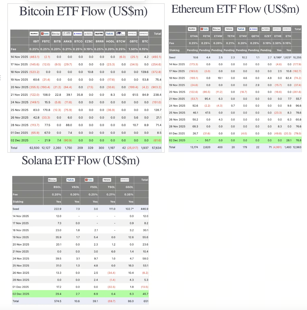 عملکرد ETFها ترکیبی بود. ETFهای بیتکوین در 2 دسامبر با 61.6$ میلیون خروج سرمایه مواجه شدند؛ در مقابل، ETFهای اتریوم 78.8$ میلیون و ETFهای سولانا 45.7$ میلیون ورودی سرمایه ثبت کردند.