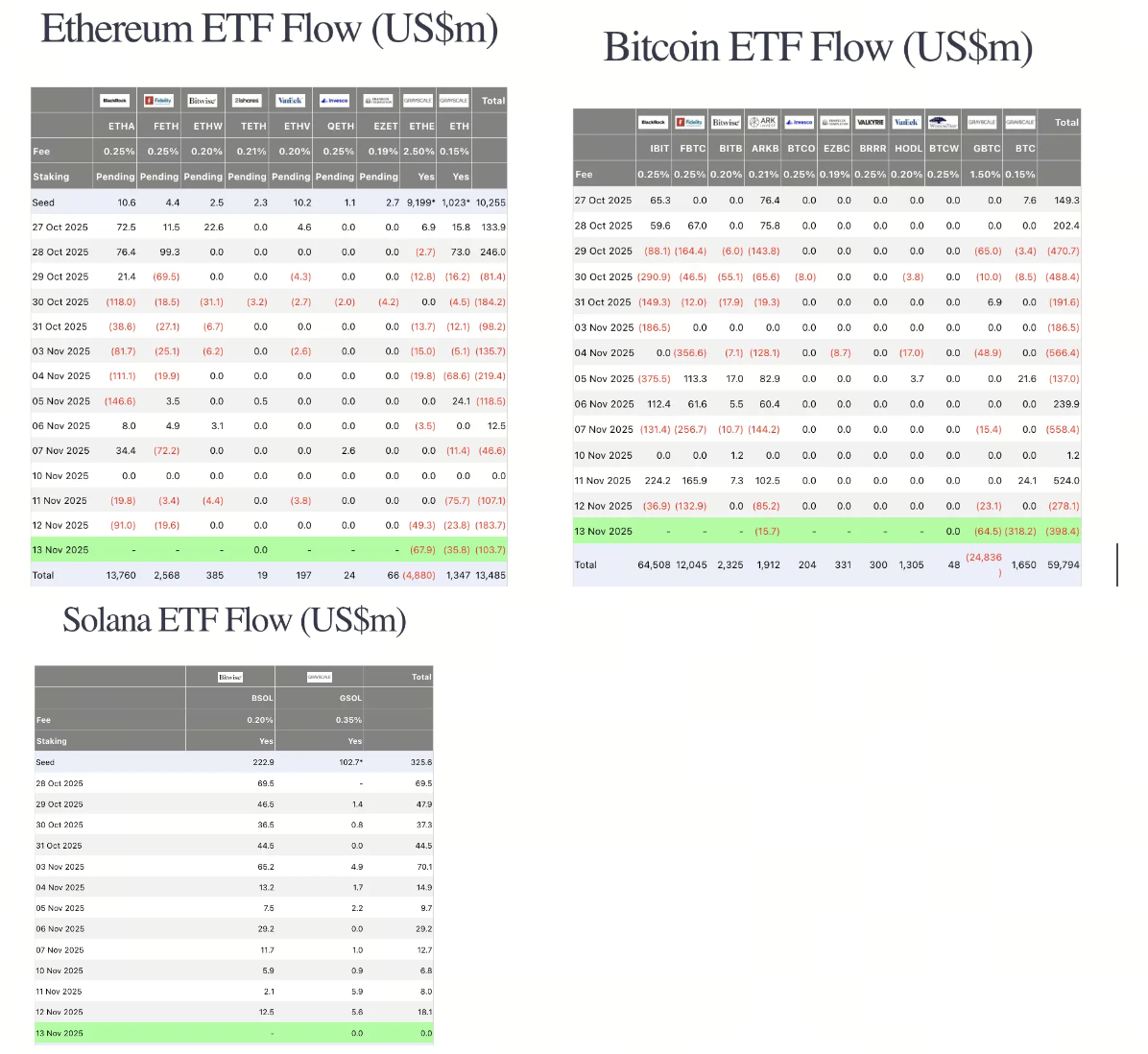 دادههای ETFهای اسپات در 12 نوامبر نشان داد: خروج $183.7 میلیون از ETF اتریوم، خروج $278.1 میلیون از ETF بیتکوین و ورود جزئی $18.1 میلیون به ETF سولانا ثبت شده است.
