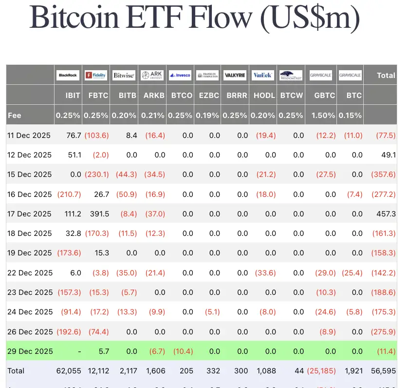 جریانهای ETF اسپات همچنان محرک واضحی برای بازار نبودند. در 29 دسامبر، ETFهای BTC با خروج خالص 11.4 میلیون دلار و ETFهای ETH با خالص ورود 3.70 میلیون دلار ثبت شد، با این توضیح که دادههای یک ارائهدهنده اصلی در این گزارش لحاظ نشدهاند؛ بنابراین این آمار جهت کلی جریانها را نشان میدهد و کامل نیست.