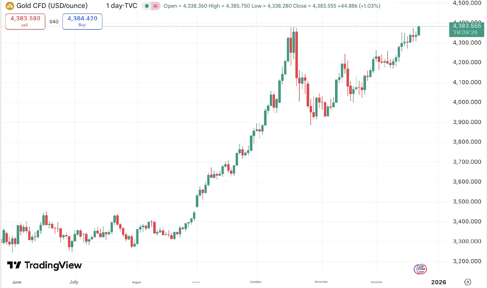 در حالی که فاز تثبیت در بازار رمزارزها ادامه دارد، داراییهای پوشش ریسک در بازارهای سنتی حرکت چشمگیری را تجربه کردند. قیمت طلا با رشد 1.04% به $4,383.55 رسید و با ثبت یک سقف تاریخی جدید (ATH)، بار دیگر تقاضا برای داراییهای تدافعی را در فضای تداوم عدمقطعیتهای اقتصاد کلان تقویت کرد.
