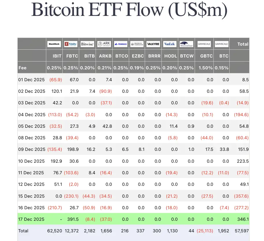 ETFها بهطور مقطعی نقش نیروی متعادلکننده را ایفا کردند. در 17 دسامبر، ETFهای اسپات بیتکوین شاهد ورود 346.1 میلیون دلار سرمایه بودند، در حالی که ETFهای اتریوم با خروج 2.80 میلیون دلاری مواجه شدند.