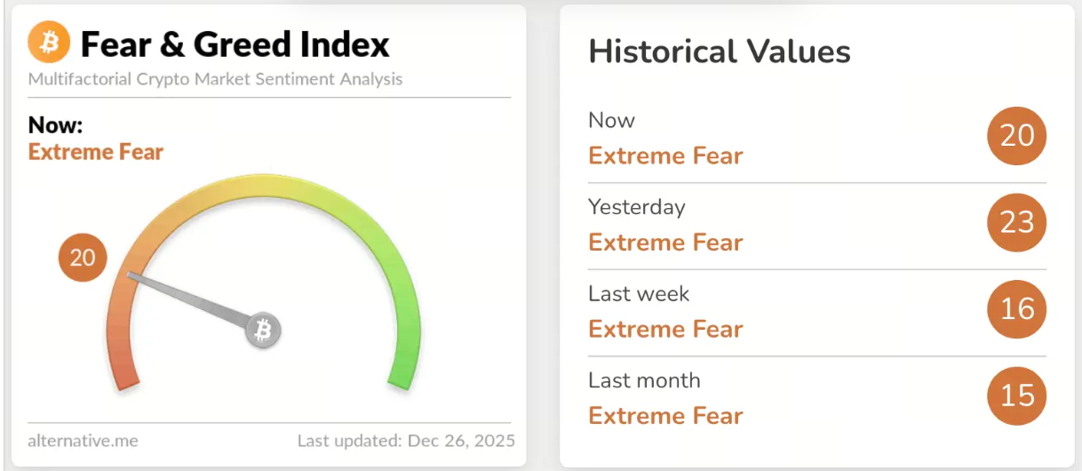 احساسات بازار همچنان شکننده است. شاخص ترس و طمع بازار رمزارزها روی عدد 20 قرار دارد که بهوضوح نشاندهنده قرار گرفتن بازار در محدوده ترس است.