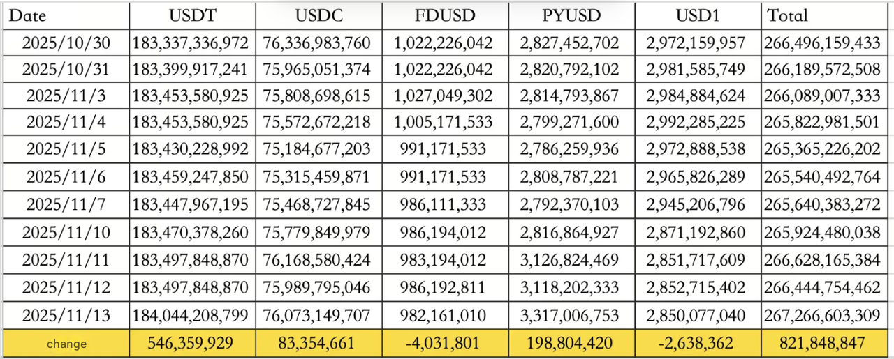 ورودیهای استیبلکوینها نشانههای ابتدایی بازیابی را نشان داد و مجموعاً $821.85 میلیون از سوی صادرکنندگان اصلی جذب شد. USDT با $546.36 میلیون پیشتاز بود و پس از آن USDC با $83.35 میلیون قرار گرفت، که عرضه کل استیبلکوینها را به $267.27 میلیارد رساند.
