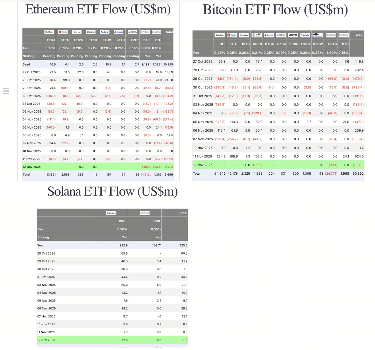 در 11 نوامبر، ETFهای اتریوم $107.1 میلیون خروجی داشتند، در حالی که ETFهای بیتکوین $524 میلیون ورودی ثبت کردند. ETFهای سولانا نیز با $8 میلیون ورودی، روند انباشت پایدار خود را ادامه دادند.