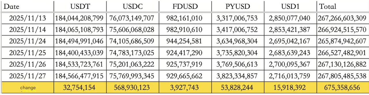 شتابگیری فعالیت استیبلکوینها برجسته بود و علیرغم تداوم ترس، نقدینگی جدیدی به بازار تزریق کرد. مجموع جریانهای ورودی به 675.36$ میلیون رسید که عمدتاً توسط $568.93 میلیون از USDC و $32.75 میلیون از USDT هدایت شد و عرضه در گردش کل را به $267.81 میلیارد افزایش داد.