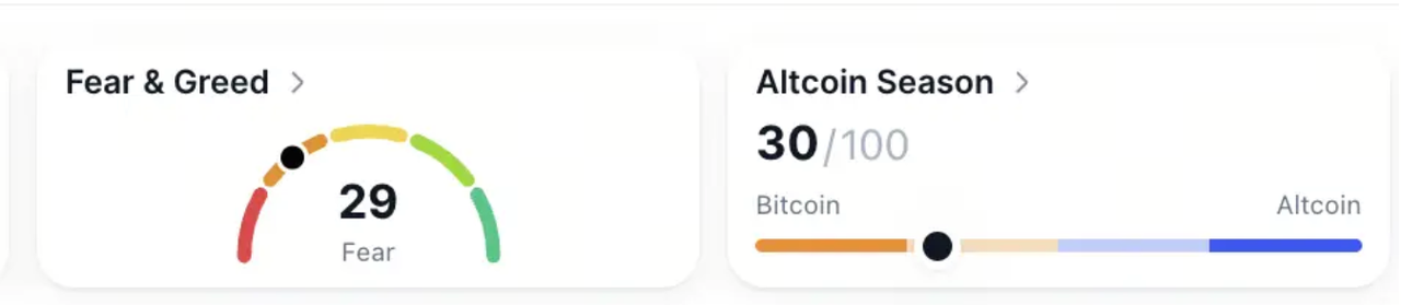 شاخص ترس و طمع در سطح 29 قرار گرفت که نشاندهنده ترس ملایم است، در حالی که شاخص فصل آلتکوینها در 30 ثابت ماند.