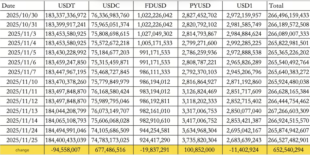 ورودی کل سرمایه به استیبلکوینها در 25 نوامبر به 652.54 میلیون دلار رسید؛ عمدتاً بهدلیل ورود 677.49 میلیون دلار به USDC و خروج 94.56 میلیون دلار از USDT. این روند، عرضه در گردش استیبلکوینها را به 266.53 میلیارد دلار رساند.