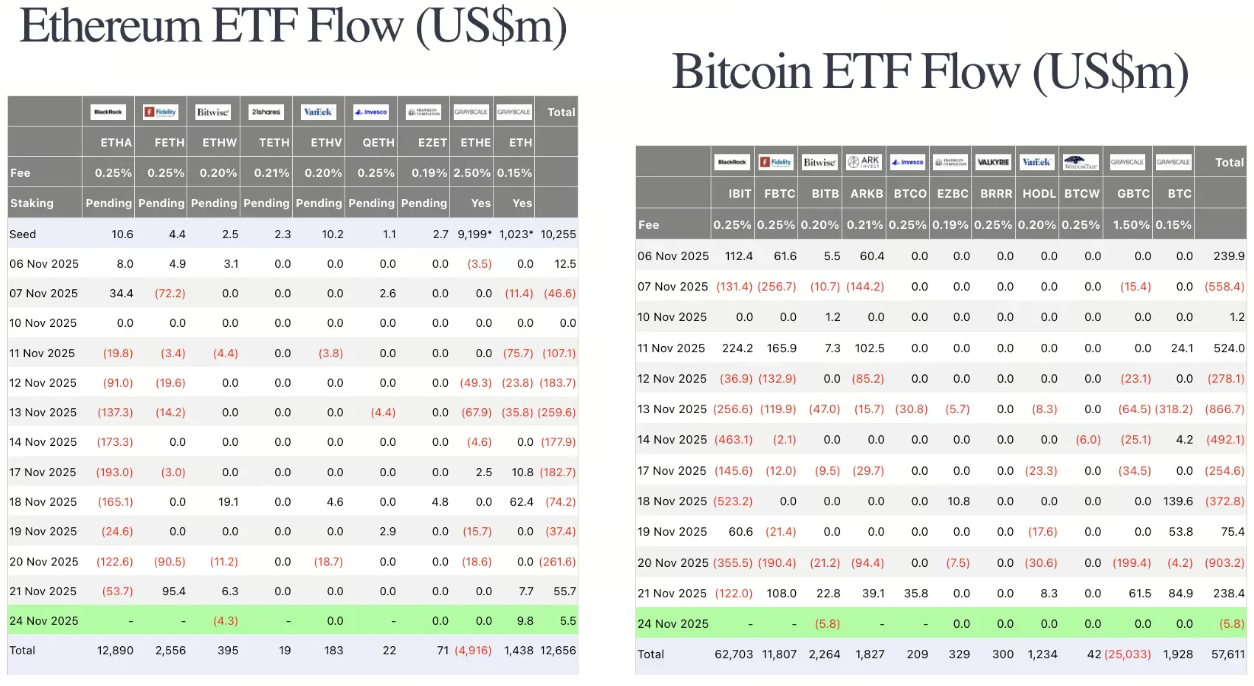 در تاریخ 24 نوامبر، ETFهای اتریوم شاهد 5.5 میلیون دلار جریان ورودی خالص بودند، در حالی که خروجی 5.8 میلیون دلاری از ETFهای بیتکوین مشاهده شد.